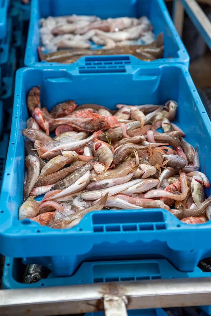 La clasificación del pescado normalmente se produce a bordo de cada embarcación. Posteriormente se depositan las cajas con cada una de las especies obtenidas para la subasta.
