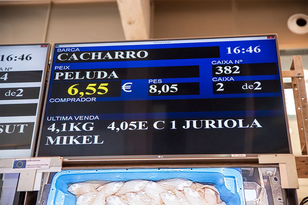 En cada una de las lonjas los pescados y mariscos se transportan en una cinta que los pesa y clasifica para la subasta. La subasta es “a la baja”, cada comprador tiene su propio mando que detiene la subasta con el precio en ese mismo momento.